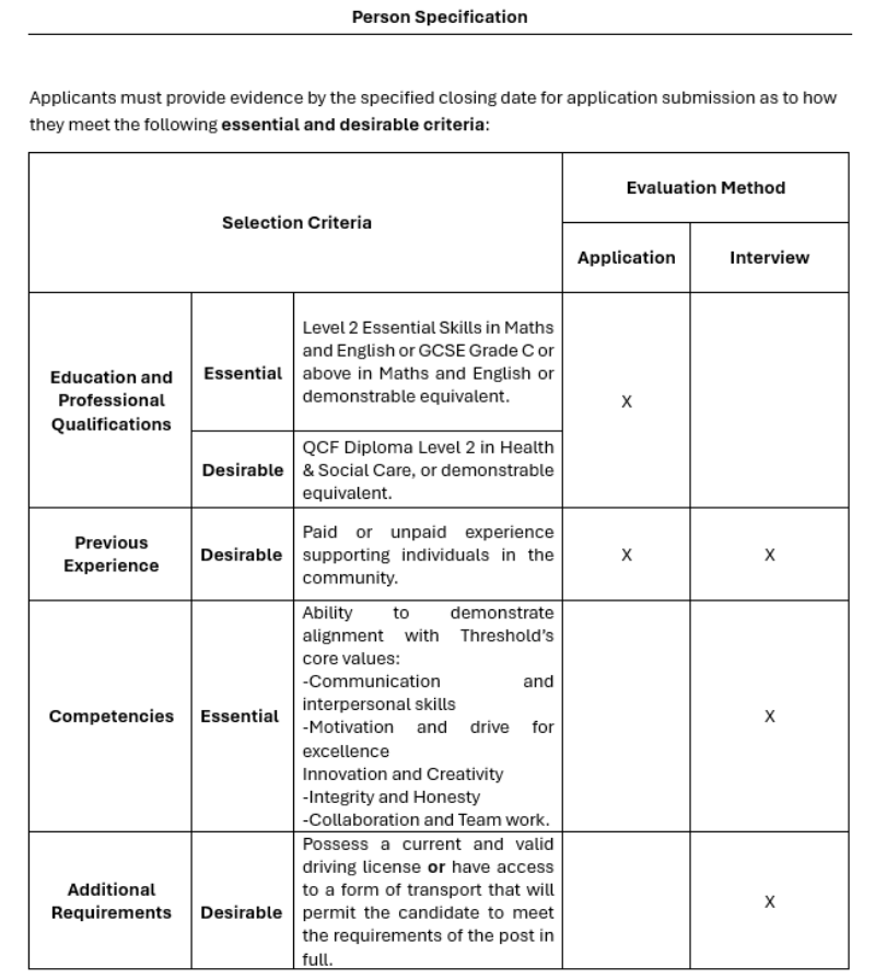 Threshold reserves the right to supplement these shortlisting criteria using additional essential and or desirable criteria from the personnel specification at subsequent stages of the shortlisting process.